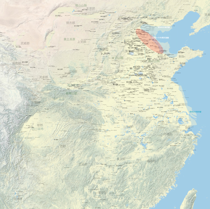 ※黄河最下流、渤海湾海岸線の詳しい解釈は幽州涿郡(第百二十九回)、冀州信都郡(第百二十四回)、安平国、安平郡/河間国、河間郡(第百二十五回)、勃海郡(第百二十八回)、青州平原郡(第百八回)の項をご参照ください。