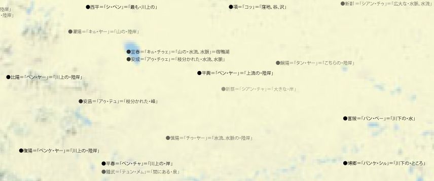 丘陵の周辺は、「山」「小山」の解釈で一致しています。また、丘陵地帯の西部は、そのほとんどが「山」「山のふもとの水辺」と解釈できます。