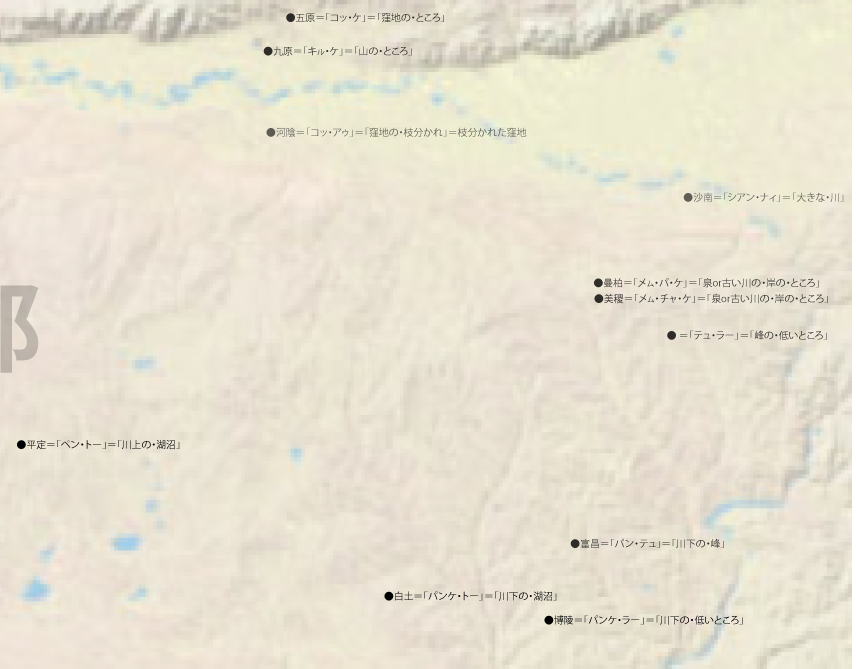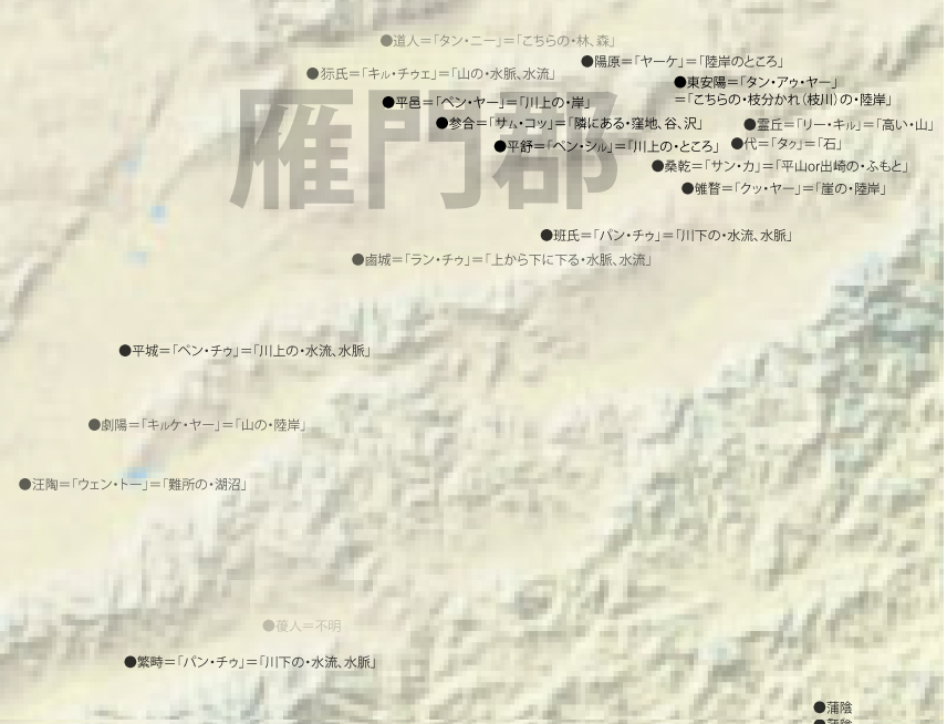大同盆地周辺には「ペン=川上」「パン=川下」の対比表現が見られます。平邑県、平舒県、平城県は洋河とその支流を基準に対比表現と解釈できます。繁畤県は滹沱河基準でしょうか。こちらは残念ながら判然としません。