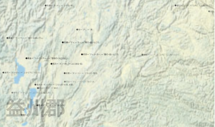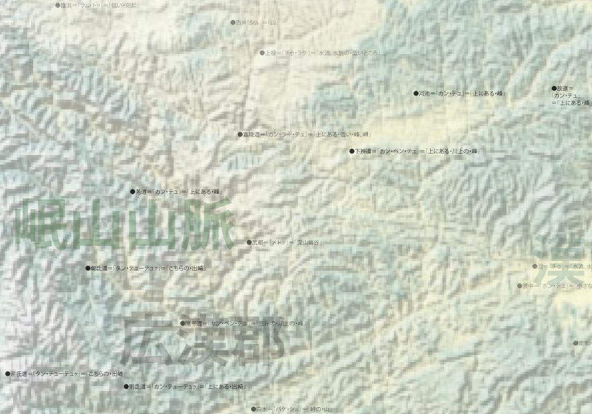 四川盆地は妥当な解釈が可能な県名があるものの、総合的に見ると、周辺の県と辻褄が合う名称が多くないので、残念ながら強く断定できるものではありません。一部確度の高そうな「川上」「川下」の対比表現、比定地を同じくする「湖沼」の同義解釈があったのでご紹介します。