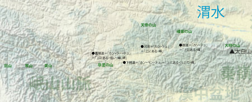 ●縄文語:嘉陵道=「カン・ラー・テュ」=「上にある・低い・峰、岬」