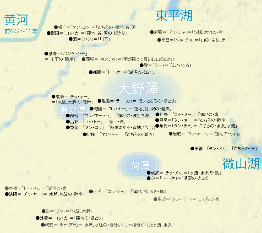 また、燕の首都の「薊城」は現在の北京市房山区となります。この周辺の北京市西部に置かれた漢代の県名はことごとく「海辺の山」を表現していて、「鉅燕=キル・ヤー=山の・陸岸」「薊=キル=山」と一致しています。紀元前602年の海岸線はこの周辺でした。