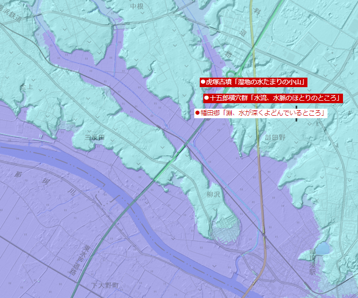 虎塚古墳の所在地をご覧下さい。 那珂川支流の中丸川沿いの低地にある峰の上に築かれています。「虎塚古墳」が「湿地の水溜まり」と縄文語解釈できるだけでなく、南に接する「十五郎穴横穴墓群」は「水流、水脈のほとりのところ」、所在地の「幡田郷」は「ハッタル=淵、水が深くよどんているところ」と解釈可能で、地勢と完全に辻褄が合っています。