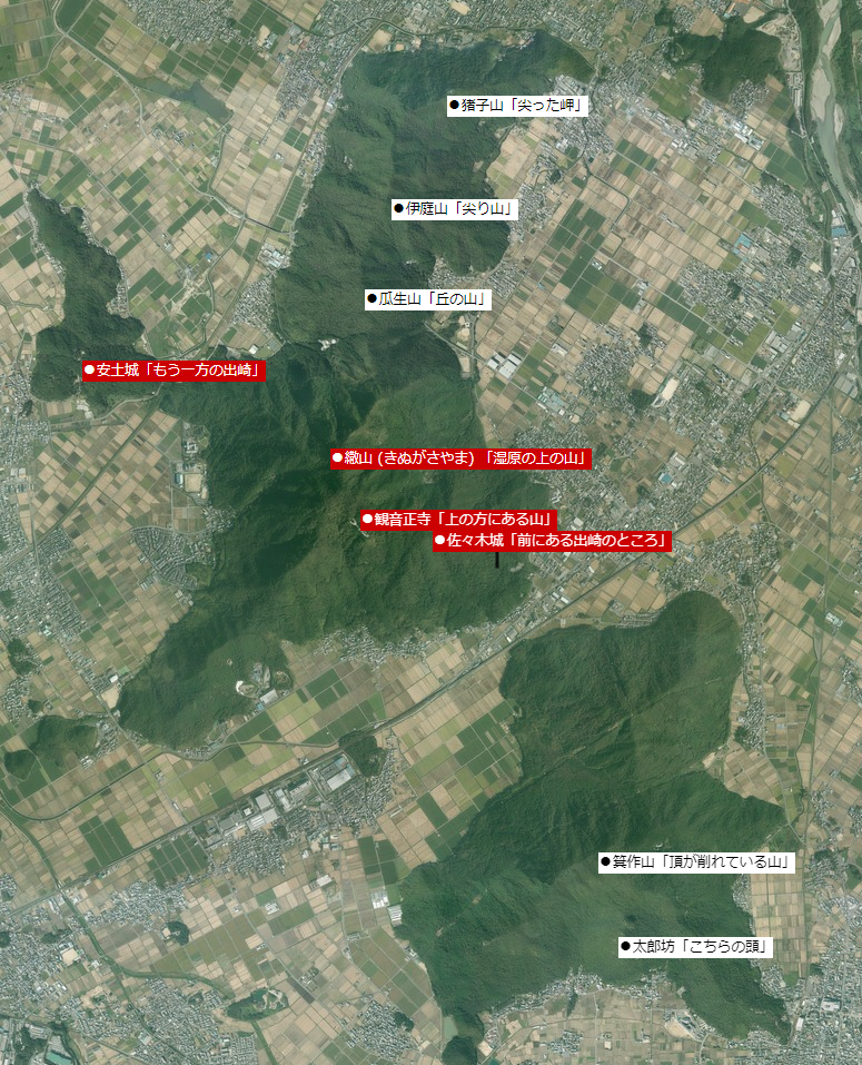 ◎縄文語:「沙沙貴山(狭々城山、佐佐紀山、佐々貴山)」=「サン・サン・ケ」=「前にある・出崎・のところ」