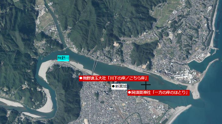 「熊野=横に平べったい岬」は本宮大社の「熊野川対岸の峰」とすれば地勢と完全に一致しますが、熊野速玉大社と熊野那智大社は地勢と一致しません。 もしかすると後者二社の「熊」は「高麗」「狛」などと同様に、熊野川下流、那智川の「湾曲する谷川」の様子を表現したのかもしれません。言うまでもなく、朝鮮建国神話の「檀君が熊から生まれた」話と「熊野」の地名はまったく関係ありません。
