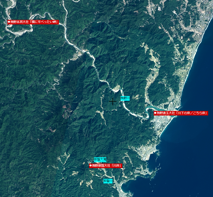 ■熊野三山 ※「熊」は「高麗」や「狛」同様に「湾曲した川」の意か。(国土地理院の電子地形図を加工して作成)