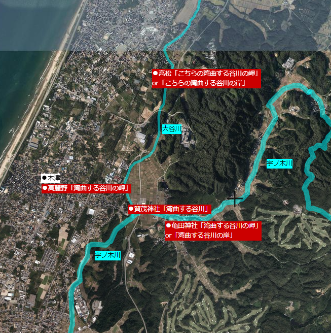 ■砺波市高瀬神社周辺 ※「水辺と岬」の解釈で一致。 (※国土地理院の電子地形図を加工して作成)
