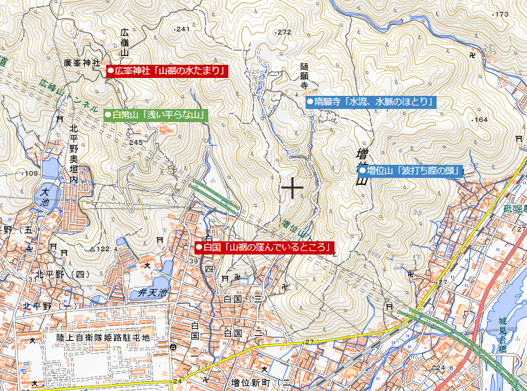 「白鷺山」に含まれる「白」は「シル・オ=山・裾」の意で、頻繁に地名に登場します。「新羅」の漢字が充てられることもありますが、言うまでも無く新羅国とはまったく関係ありません。「白浜」は「山裾の浜」、「新羅明神」は「山裾の神社」です。神社のデタラメ由緒に騙されていちいち渡来人の活躍を語ってはいけません。