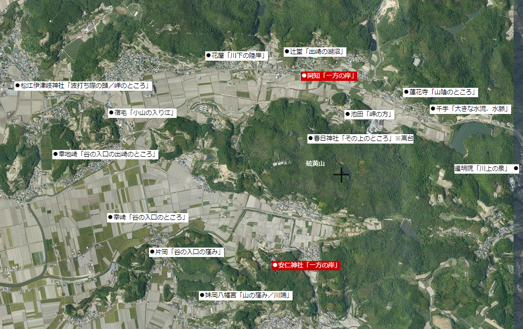 「阿知」地域と「安仁神社」は、硫黄山によって南北に分けられた谷になっています。つまり、「一方の岸」な訳です。日本国中、川が分岐しているところにはことごとく阿知使主を祭ればいいのではないでしょうか。