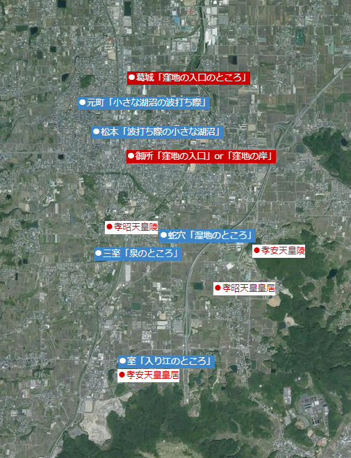 この周辺が第五代「孝昭天皇」、第六代「孝安天皇」の拠点となっています。それぞれ、筆者が比定している「大国主」の息子の「事代主」と「建御名方」です。