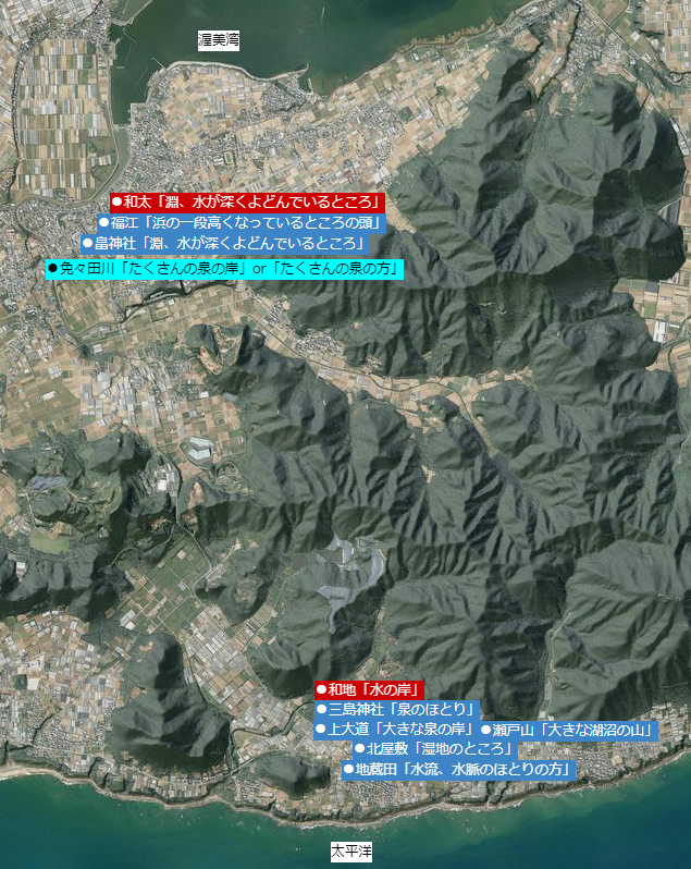 の意で、これも”上町台地の湧水”を指しただけです。また、天日槍は城崎温泉、都怒我阿羅斯等(別名:于斯岐阿利叱智干岐)は敦賀半島の縄文語地名です。