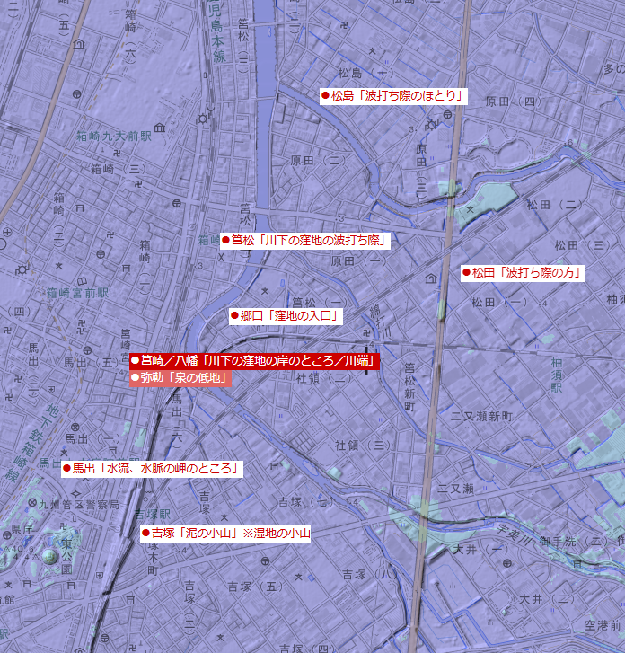 「松島」と「松田」、「馬出」と「吉塚」は同義で、言い換え表現となっています。いずれも"水辺"だったことが分かります。
