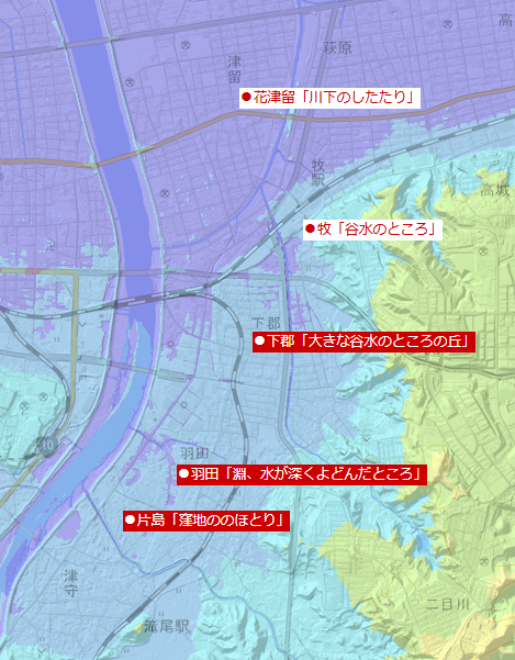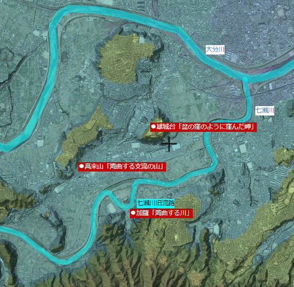 これらすべて「川沿いの低地(の山)」の解釈で辻褄が合います。地勢とも完全に一致しています。