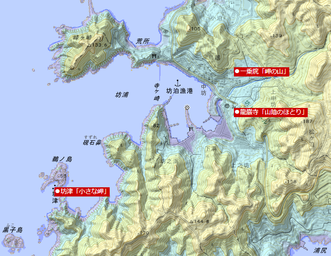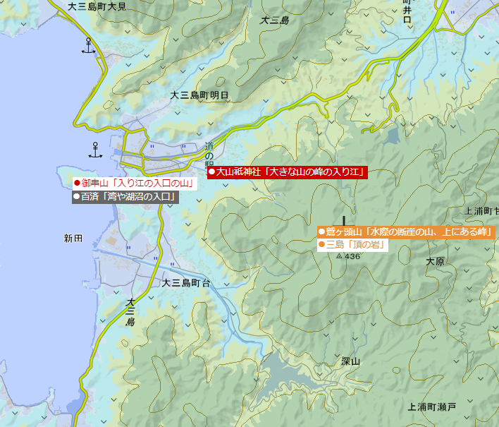 ■大三島大山祇神社周辺の縄文語解釈 (※国土地理院の電子地形図を加工して作成)