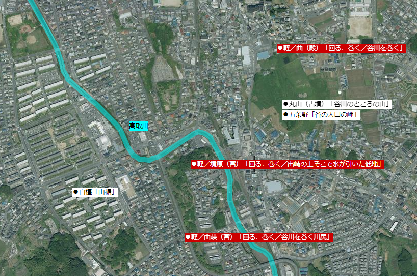■「軽」周辺 ※高取川が曲がっているところ。(国土地理院の電子地形図を加工して作成)