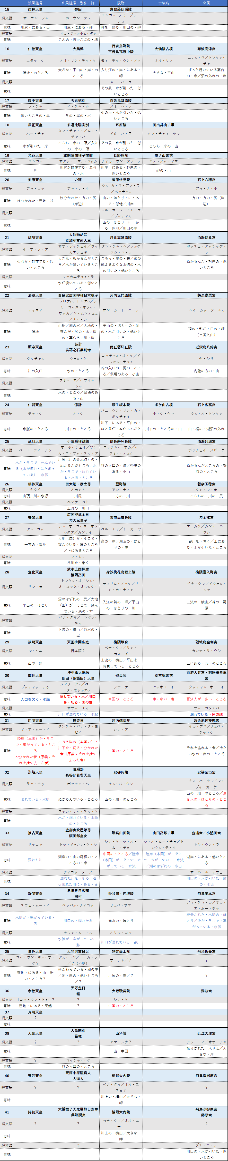 以下に第十五代応神天皇から第四十一代持統天皇までの縄文語解釈の一覧を挙げます。